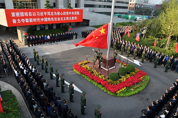 清晨惠風(fēng)和暢,鮮艷的五星紅旗映著朝陽(yáng)。在激昂雄壯的《義勇軍進(jìn)行曲》中,全場(chǎng)人員莊嚴(yán)肅立,高唱國(guó)歌,行注目禮,目送國(guó)旗冉冉升起,為偉大祖國(guó)送上深情祝福。